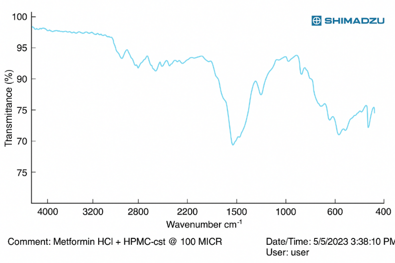 For the API-excipient compatibility study, the API (Metformin HCl) was combined with excipients in equal weight portions and incubated in glass vials sealed with Teflon plugs and aluminum caps at 40 °C and 75% relative humidity for 6 mo. Infrared (IR) spectroscopy was used to analyze the stability of the drug in the blended mixture after 6 mo. The Fourier transform infrared spectroscopy (FTIR) spectra of API-HPMC K100M and API-Carbopol971P, stored for 6 mo at 40 °C, were compared with the spectrum of the API to assess changes in the API structure.
