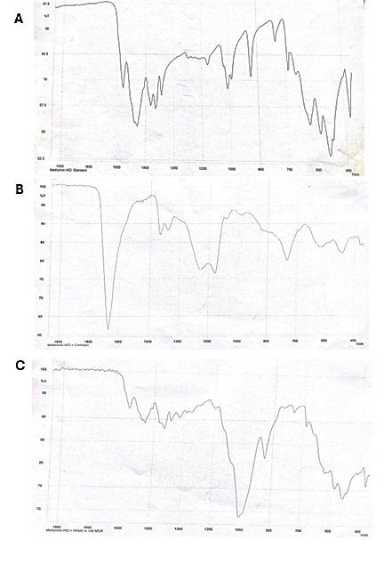 Fig. 3: IR spectra of API and API-excipient mixture after incubation for 6 mo at 40 °C and 75% relative humidity for 6 mo. A) Metformin HCl B) Metformin HCl with Carbopol971P C) metformin HCl with HPMCK100M