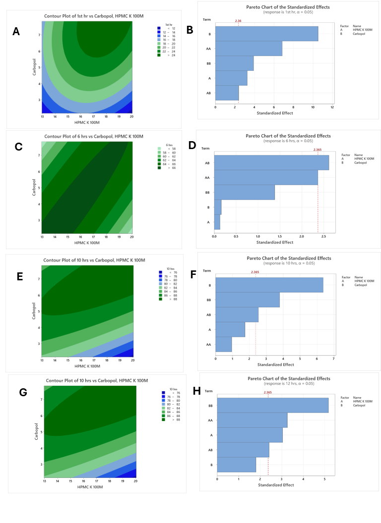 The release at the 12th h is most influenced by the non-linear effect of Carbopol, followed by the non-linear and linear effects of HPMC K100M. The quadratic effect of Carbopol (BB) had the most substantial influence on 12th h drug release, followed by the quadratic and linear effects of HPMC K100M (AA and A, respectively) (fig. 4H). While HPMC showed both linear and non-linear contributions, Carbopol’s linear effect (B) was not statistically significant. The interaction between HPMC and Carbopol (AB) also did not significantly affect the release profile. Similar results were obtained by Deb et al. [17]. In the study, higher Carbopol concentrations significantly retardedthe early release of drug from Metformin-loaded microspheres, while increasing HPMC concentration produced a more subtle delay [18].