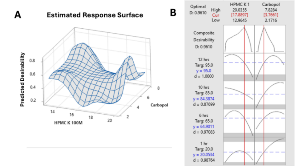 Fig. 5: A) Response surface Plot. B) Response optimization: 12, 10, 6, and 1st h drug release