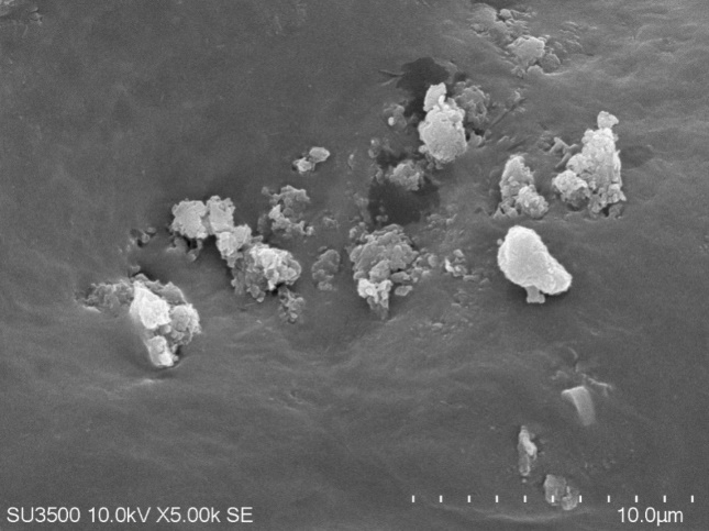 SEM characterization is used to observe the morphology of a particle [24]. SEM analysis was carried out on the optimized nanoparticle powder of snakehead fish extract using alginate polymer (F2). At 5000x and 10.000× magnification, the nanoparticles appeared coated but showed an irregular, non-spherical shape with rough surfaces and visible aggregates (fig. 1). Ideally, nanoparticles should be spherical to improve their ability to enter target cells. The presence of aggregates may be caused by van der Waals forces, which are stronger at the nanoscale due to the large surface area of the particles. As a result, particles tend to stick together and form clumps [25]. The uneven surface might be due to incomplete polymer cross-linking during the formulation process and the adhesive properties of albumin are influenced by charged amino acids, such as lysine, which undergo electrostatic interactions that enhance its adhesion [26]. This phenomenon may also occur because the freeze-drying process imposes significant stress, affecting the stability of colloidal nanoparticle suspensions, thereby making them susceptible to aggregation or irreversible fusion between particles. Such issues can be mitigated by the addition of protective agents, namely cryoprotectants such as trehalose, sucrose, glucose, and mannitol [7-9]. Aggregation of nanoparticles during lyophilization is often driven by freezing-and drying‑induced stresses such as ice‑crystal formation and solute‑concentration at ice–liquid interfaces, which promote particle–particle contact and fusion. Cryoprotectants like sucrose or trehalose act by forming a vitrified matrix or by shielding particles, thereby reducing mechanical stress and isolation of individual nanoparticles to mitigate aggregation [26].