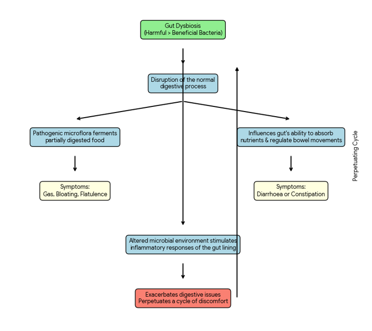 Gut dysbiosis is the condition of having an imbalance of the bacterial composition of the gut, where harmful or dangerous bacteria outnumber those that are beneficial. Disrupting the normal digestive process. Symptoms such as bloating, diarrhoea, constipation, and flatulence can occur when there is disruption of the body's natural digestive cycle. When pathogenic microflora ferments partially digested food, it can lead to gas and bloating in the body [86]. Additionally, dysbiosis may affect the gut's capacity to absorb nutrients and control bowel movements, leading to constipation or diarrhoea. The changed microbial habitat also probably triggers inflammatory reactions in the gut lining, aggravating digestive problems and creating a vicious circle of discomfort [87, 88].