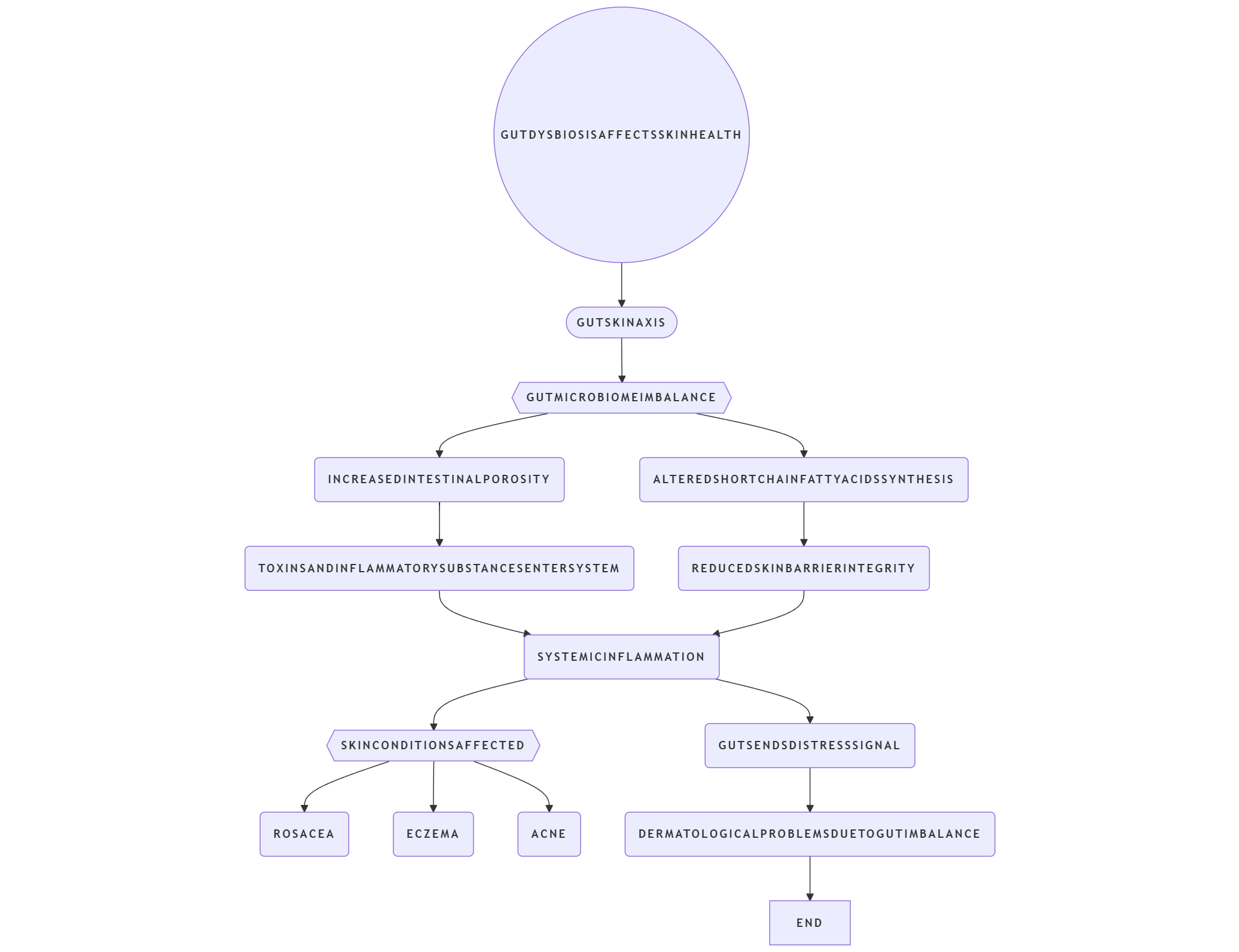 Gut dysbiosis and implications on skin health via the gut–skin axis Gut dysbiosis can affect skin health through the gut-skin axis, when an imbalance in the gut microbiome influences inflammation and immunity [89]. Increased intestinal permeability brought on by the expropriation of harmful microbes allows toxins and inflammatory chemicals to enter the human body. Skin conditions like rosacea, eczema and acne can be caused by or exacerbated by this systemic inflammation. Dysbiosis can also alter the synthesis of short-chain fatty acids (SCFA), which are important for maintaining skin barrier integrity and levels of inflammation. In essence, the body receives a distress signal from the injured gut. [90]. It also includes skin, resulting in several dermatological problems caused due to gut imbalance.