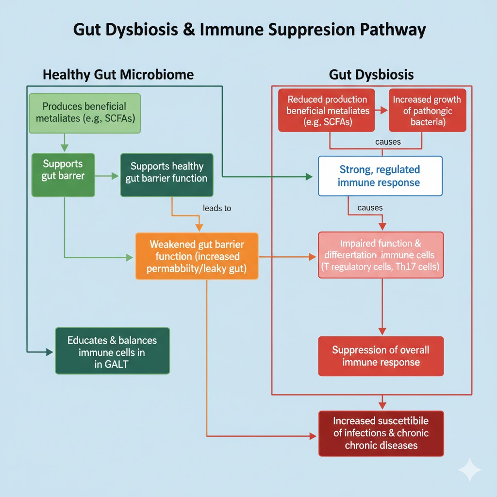 Immunity can indeed be influenced by an imbalanced gut microbiome. A critical region for immune function is the Gut-Associated Lymphoid Tissue (GALT). A disturbed microbiome can lead to an oversensitive or ambivalent immune response. The immune system may fail to adequately defend the body against infection or incorrectly attack cells in the body (autoimmunity) as a result of this imbalance. Increased permeability of the intestine that is induced by dysbiosis could ultimately allow toxins to access the circulation and inflammation [97].