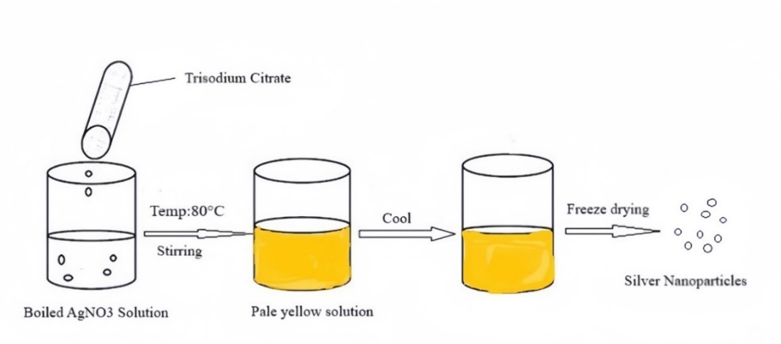 We employed a molar ratio of silver nitrate to trisodium citrate of 1:3, deviating from common ratios (e. g., 1:1). This increased citrate concentration enhances its dual role as a reducing and capping agent, improving colloidal stability and preventing aggregation.
