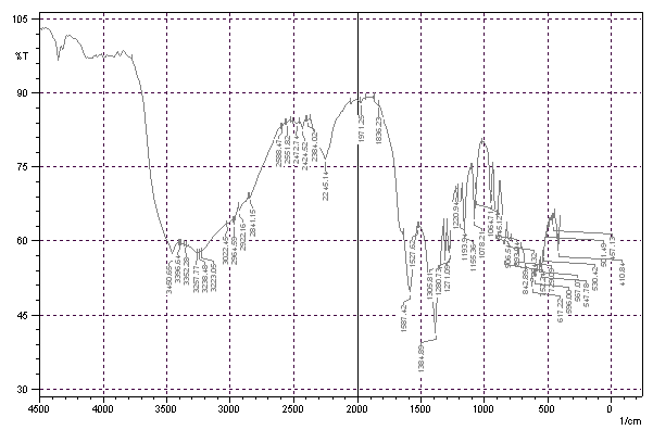 The spectrum of pure sodium citrate (fig. 5) displays characteristic peaks of its carboxylate groups. The strong, broad band centered at ~3450 cm⁻¹ is attributed to O–H stretching vibrations. The two most significant features are the asymmetric stretching vibration (νₐs COO⁻) at 1587 cm⁻¹ and the symmetric stretching vibration (νₛ COO⁻) at 1390 cm⁻¹ [27, 28].