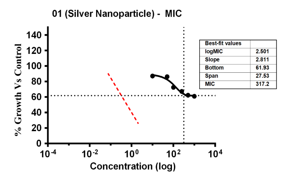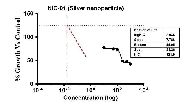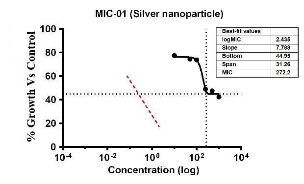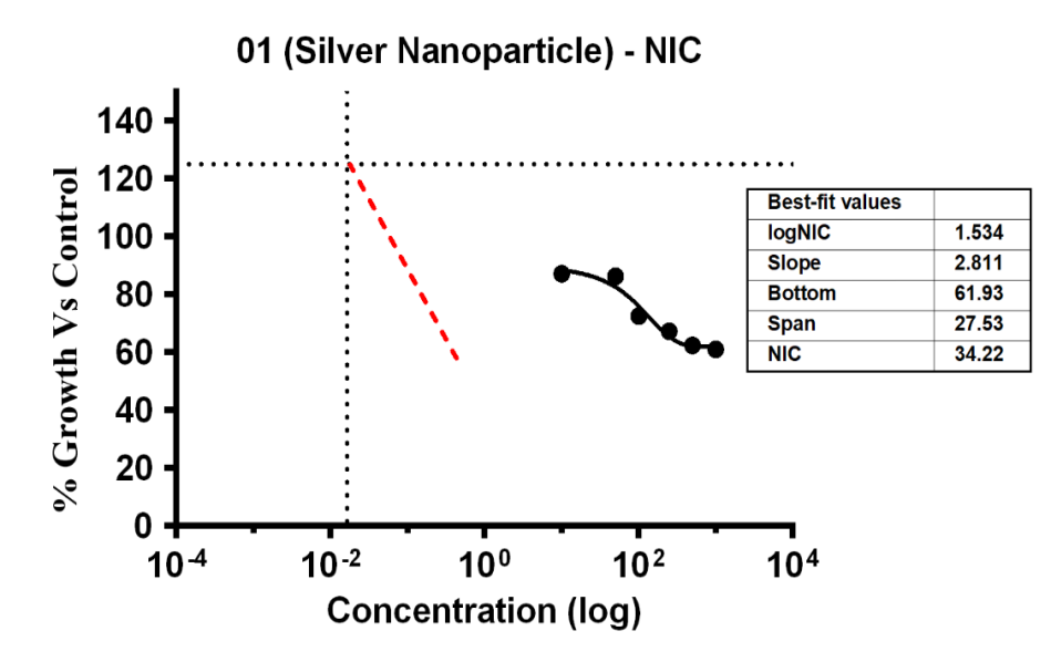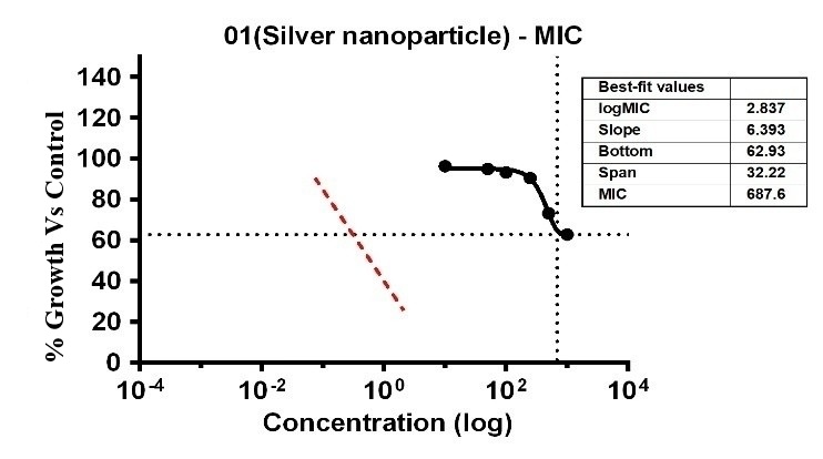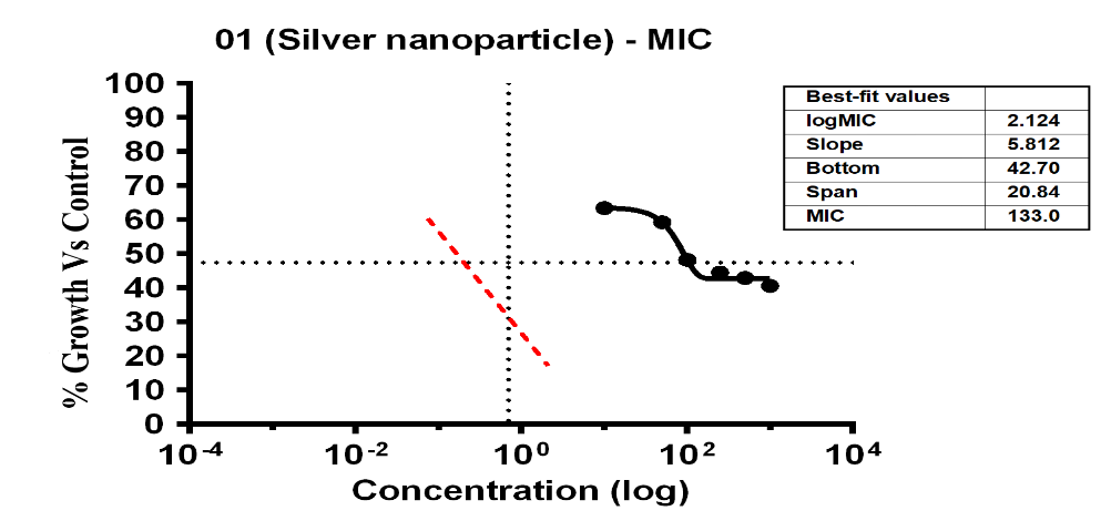 0.5McFarland standard dilution of the microorganisms was employed in the investigation. Five microliters of prepared treatment dilutions of varying strengths (0 µg/ml, 1.08 µg/ml, 5.42 µg/ml, 10.79 µg/ml, 26.97 µg/ml, 53.94 µg/ml, and 107.87 µg/ml) were added to the designated tubes after 100 µl of diluted log cultures of the test organism (E. coli–MTCC 452) had been introduced to the microcentrifuge tube. The tubes were then incubated for twenty-four hours. Following incubation, all of the material was moved to a 96-well plate, and a turbidity reading was obtained at 630 nm using an Elisa Plate Reader (iMarkBiorad). Graph Pad Prism-6 and the gompertz model were used to estimate the MIC and no inhibitory concentration (NIC) values. Additionally, the graph displays the junction of the curve’s projection at the inflection point (red angled) and the horizontal line at the curve's top (or bottom) plateau (horizontally dotted). The logarithm of concentration was shown on the X-axis, and the percentage of growth relative to control was shown on the Y-axis [17, 18].