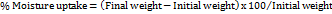 Films were placed in a desiccator maintained at ambient conditions for 24 h. The desiccatorwas loaded with saturated potassium chloride solution to maintain relative humidity of 84%. The films were taken out post 24h and weighed. Percentage of moisture uptake was calculated by the following formula [23].