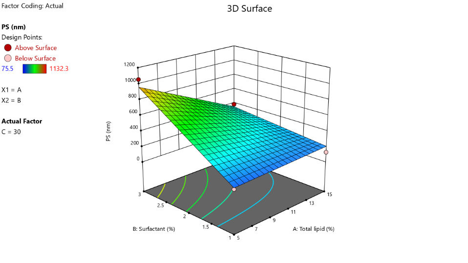 Response surface methodology was used to optimize the CMAs and achieve desirable CQAs. The polynomial equations generated by the software modelled the experiment. It can be observed that increasing total lipid and liquid lipid contents increased the particle size, while increasing surfactant concentrations helped to achieve a lower particle size. The increased surfactants stabilized the emulsion and reduced interfacial tensions to reduce the particle size. However, a few outliers were observed during the study, showing widely varying particle sizes in some of the batches (F3, F7, F12). This can be plausibly due to the inherent instability of nanoemulsions at certain lipid/surfactant ratios, leading to coalescence or incomplete solidification. These outliers were not replicated and the future work can encompass replicating these batches to confirm the status of outliers.