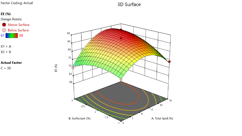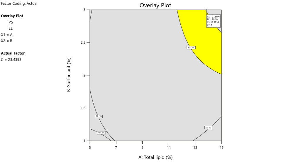 A three-factor, three-level BBD was employed using Design-Expert software (Stat-Ease, USA). Independent variables: total lipid content (X1: 5-15%), surfactant concentration (X2: 1-3%), liquid lipid content (X3: 20-40%). Responses: particle size (Y1, minimize) and entrapment efficiency (Y2, maximize). Seventeen runs generated by the software (Design-Expert® version 13, Statease Inc., USA) were conducted (table 1,2). Quadratic models were fitted, and ANOVA assessed significance (p<0.05). Representative coded equations were used to guide optimization and were validated experimentally. Graphical optimization identified the design space for desired attributes (PS<200 nm, EE>80%) [20].