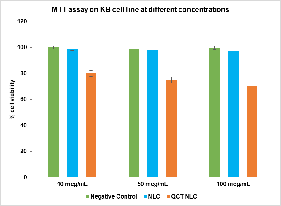The cytotoxicity of the nanostructured lipid carrier (NLC)-based buccal film was assessed using the 3-(4,5-dimethylthiazol-2-yl)-2,5-diphenyltetrazolium bromide (MTT) assay on the KB human oral epidermoid carcinoma cell line [27, 28]. KB cells were maintained in Dulbecco’s modified Eagle medium (DMEM) supplemented with 10% fetal bovine serum (FBS) and 1% penicillin-streptomycin at 37 °C in a humidified incubator with 5% CO₂. Cells were seeded at a density of 1 × 10⁴ cells per well in 96-well plates and allowed to adhere for 24 h prior to treatment. The NLC dispersion was serially diluted in medium to achieve concentrations ranging from 0.1 to 100 µg/ml based on QCT content. Cells were exposed to these dilutions, along with blank NLC and untreated controls, for 24 h. Subsequently, the medium was replaced with fresh medium containing 0.5 mg/ml MTT, and the plates were incubated for 4 h at 37 °C to allow formazan crystal formation. The supernatant was discarded, and 100-200 µl** of dimethyl sulfoxide (DMSO) was added to each well to solubilize the crystals, with gentle shaking for 10-30 min. Absorbance was measured at 570 nm using a microplate reader, and cell viability was calculated as a percentage relative to untreated controls using the formula: (absorbance of treated cells/absorbance of control cells) × 100 [27].