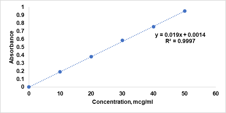UV-visible spectrophotometry was utilized to construct the standard calibration curve for dolutegravir. The drug was precisely weighed, and 0.1N HCl was used to dissolve it to create a stock solution of dolutegravir. A series of standard solutions with concentrations ranging from 10 to 50 μg/ml were generated using this stock solution in calibrated volumetric flasks. To prepare for any background interference, 0.1N HCl was used to blank the UV-visible spectrophotometer(UV 1700, Shimadzu, Japan) before each standard solution was examined at 260 nm [11]. Absorbance values for each concentration were recorded. The calibration curve was constructed by plotting the recorded absorbance values against their corresponding concentrations. Linear regression analysis was performed on the calibration curve data to establish the relationship between absorbance and concentration, determining the slope, intercept, and correlation coefficient (R²) [12].