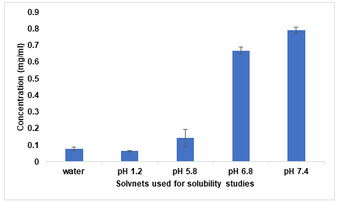 The saturation solubility study demonstrated that DTG exhibits pH-dependent solubility. It was observed that solubility increased with increasing pH with very low solubility in pH 1.2 buffer. Solubility in distilled water was lower than in pH 5.8 buffer (fig. 3). This pH-dependent solubility profile is important for understanding the drug's behavior in different physiological environments and highlights the need for solubility enhancement strategies [29].