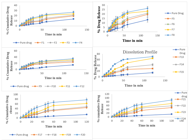 Fig. 9: In vitro drug release profile of formulations in comparison with pure drug a. F1-F4, b. F5-F8, c. F9-F12, d. F13-F16, e. F17 to F20, f. F21 to F24, Data are given as mean±SD, n =3