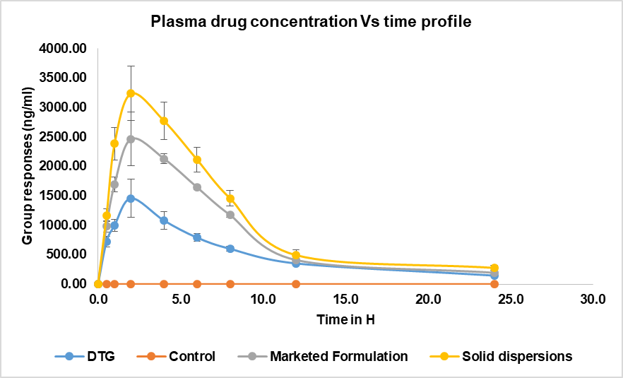 The solid dispersion maintained higher plasma concentrations throughout the 24 h period, indicating improved bioavailability. These results suggest that the solid dispersion formulation significantly enhanced the oral bioavailability of dolutegravir compared to both the pure API and the marketed formulation. This improvement can be attributed to the increased solubility and dissolution rate of dolutegravir in the solid dispersion form, leading to enhanced absorption and higher plasma concentrations over an extended period. This improvement can reduce the dose strength, improve tolerability, and have fewer side effects.