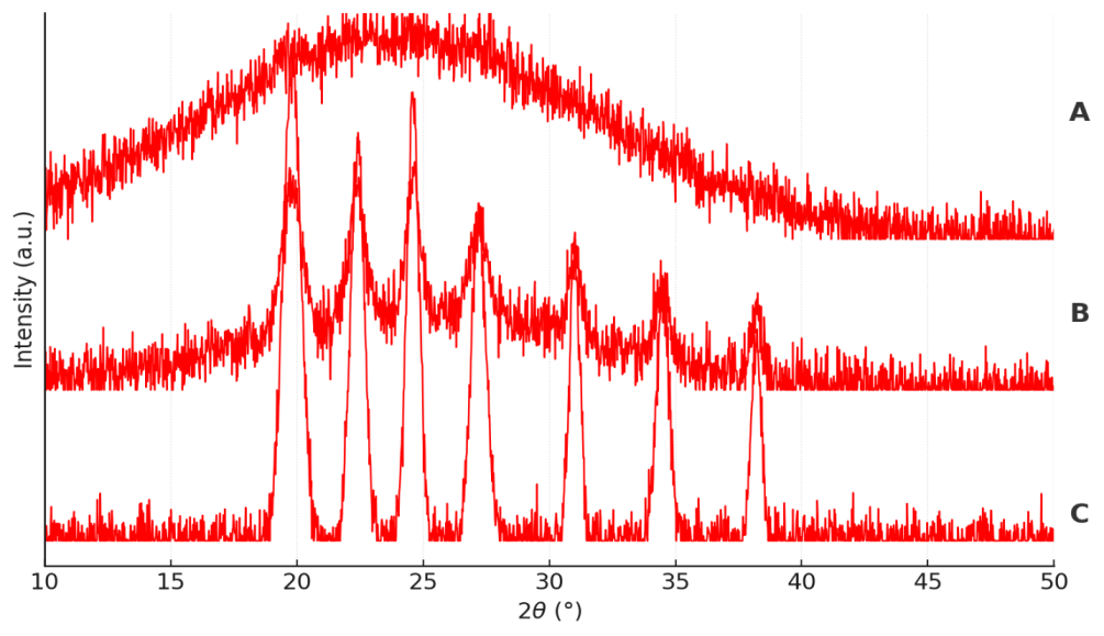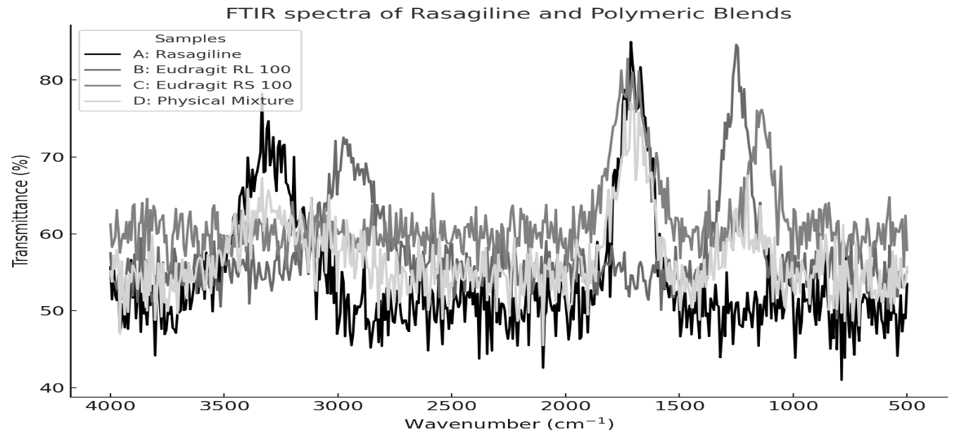 FTIR analysis was employed to investigate possible drug–polymer or drug–excipient interactions. Spectra of pure rasagiline, individual polymers (Eudragit® RS100, RL100), and their physical mixtures were recorded in the 4000–600 cm⁻¹ region using ATR-FTIR (Shimadzu IR Prestige 21). The data were processed with Opus software (Bruker, Germany) [21].
