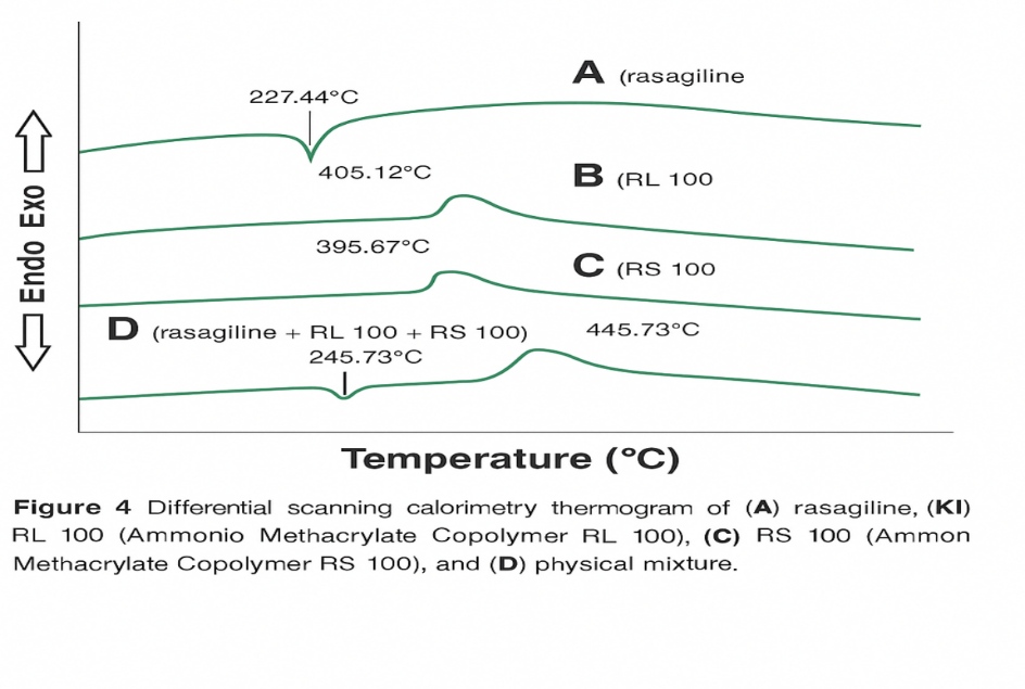 Thermal behavior of rasagiline, polymers, and their binary blends was investigated using DSC (SDT Q600, TA Instruments, USA). Approximately 3–5 mg of sample was sealed in aluminum pans and heated under nitrogen at 20 °C/min within the range of 30–800 °C. The thermograms were analyzed for melting transitions, enthalpy changes, and possible interactions.