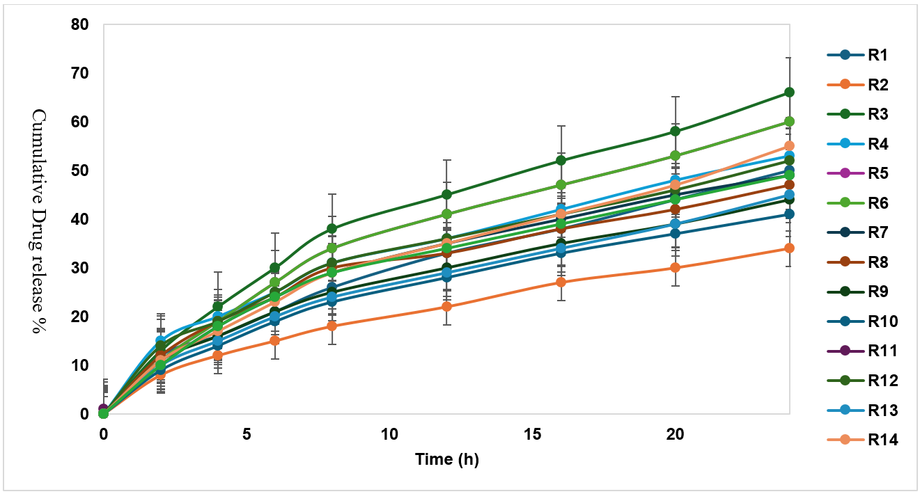 The cumulative percentage of drug released from patches R1–R15 was calculated, and release profiles were plotted against time. Among the prepared formulations, batch R7, containing a 7:3 ratio of Eudragit RL 100 to Eudragit RS 100, demonstrated the highest cumulative drug release compared to other polymeric blends. This observation suggests that the release behavior was strongly influenced by the relative proportions of the two methacrylate copolymers.