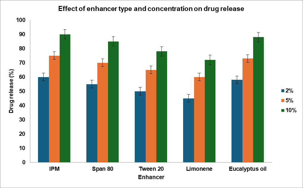 Fig. 7: Effect of different permeation enhancers and their concentrations on drug release from the formulated system, including isopropyl myristate, Span® 80, Tween® 20, limonene, and eucalyptus oil, with a comparison of the optimal enhancer levels showing maximum drug release (mean±SD). Abbreviations: IPM, isopropyl myristate; Euc, eucalyptus