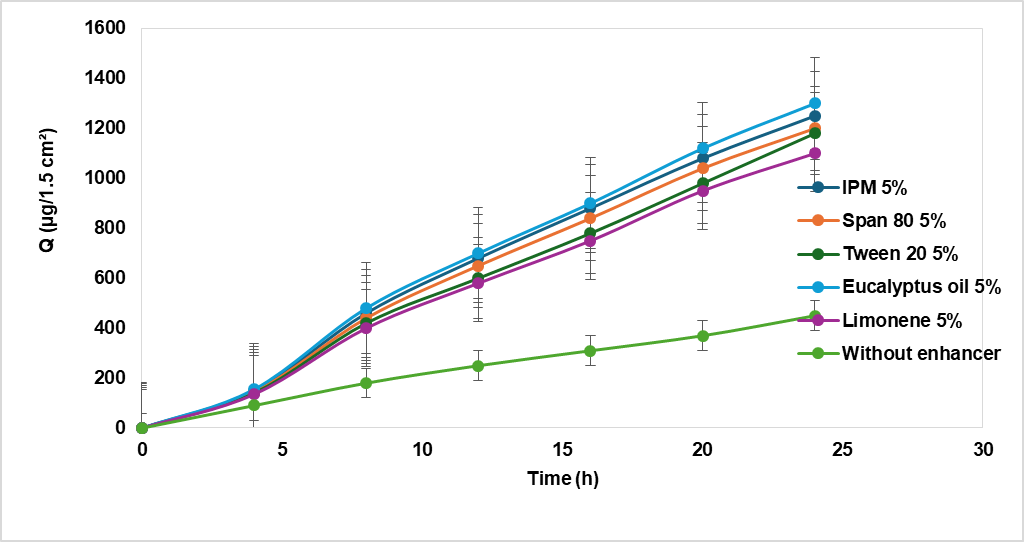 The permeation profiles demonstrated that enhancer incorporation significantly improved drug transport across the skin. The permeation flux (J), cumulative permeated amount at 24 h (Q_24), and enhancement factor (EF) for each formulation were calculated and are summarized in table 5 [45].