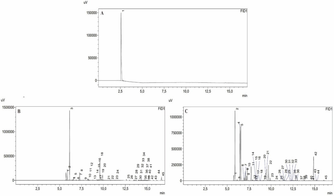 Fig. 1: Chromatogram of GC-FID analysis results. (A) Ethanol standard. (B) Ginger Grass essential oil. (C) Nutmeg essential oil