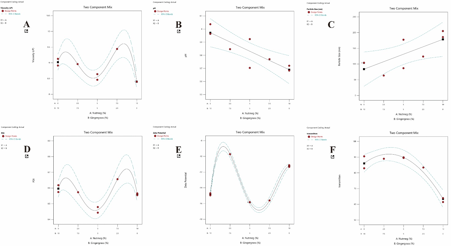 Fig. 2: Response graph generated based on component coding for EO-Nes formulation with a combination of ginger grass and nutmeg using the Simplex Lattice Design. (A) Viscosity value. (B) pH value. (C) Particle size. (D) Polydispersity Index Values. (E) Zeta Potential Values. (F) Transmittance percent values