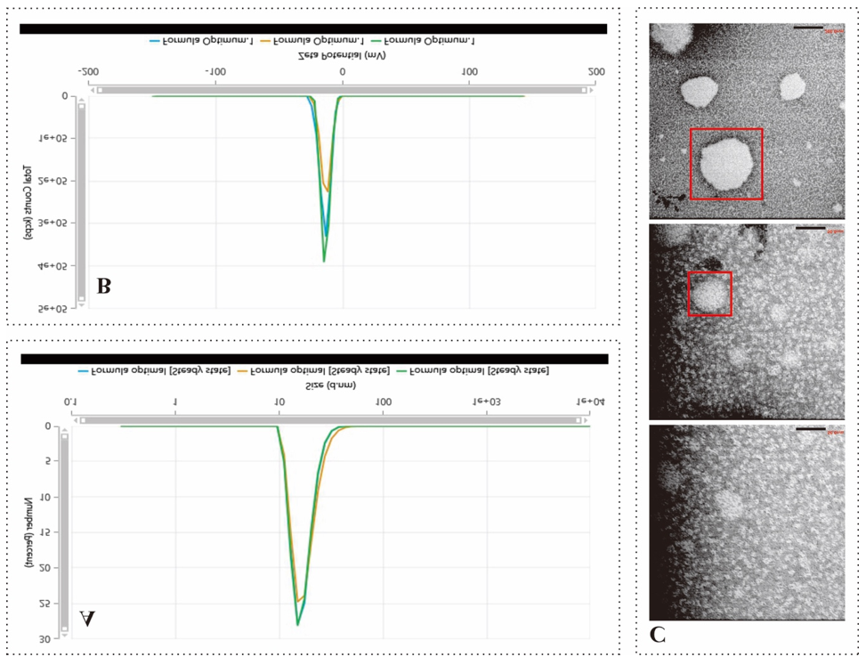 Fig. 3: (A) Graph of EO-Nes particle size distribution. (B) Graph of EO-Nes zeta potential values. (C) Morphology of EO-Nes