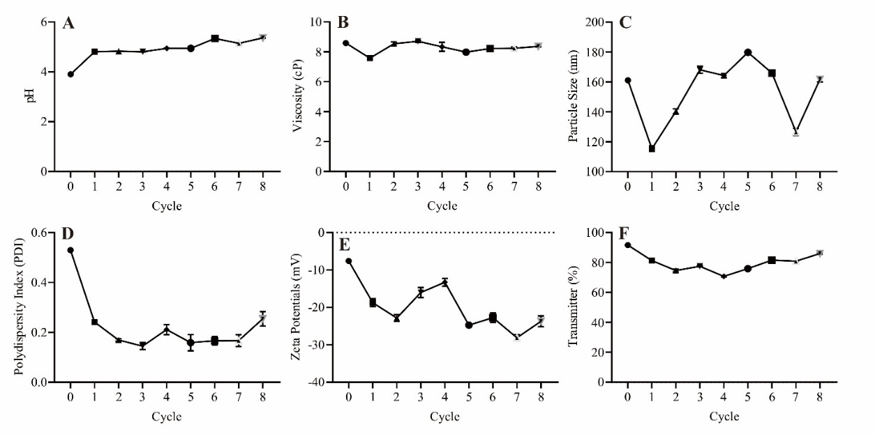 The Polydispersity Index (PDI) and zeta potential also showed significant results (p<0.0001 for all cycles), indicating the particle size distribution and electrostatic charge stability on the particle surface due to the temperature cycles. A decrease in zeta potential may indicate reduced stability in the nanoemulsion system due to lower repulsion forces between droplets, increasing the likelihood of coalescence. The PDI remained low, ranging from 0.10 to 0.24, which suggests that the particle size distribution is sufficiently homogeneous and complies with nanoemulsion standards, which set PDI<0.3 as an indicator of stability [54]. The zeta potential value theoretically falls below the electrostatic stability limit (±30 mV) [19]. However, such a result does not necessarily indicate instability, as the system uses Tween 80, a nonionic surfactant that operates via steric mechanisms. Thus, despite the zeta potential falling outside the ideal range, the system can remain practically stable.