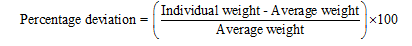 Twenty tablets from each batch were randomly selected and weighed individually on an analytical balance (AUW220D, Shimadzu Corporation, Kyoto, Japan). The mean weight was calculated, and the percent deviation for each tablet was computed as: