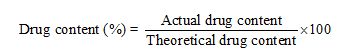 As per pharmacopeial specifications, acceptable limits for drug content are 85–115% of the label claim with a relative standard deviation (RSD) not exceeding 6%. All determinations were carried out in triplicate (n = 3) to ensure reproducibility [45].