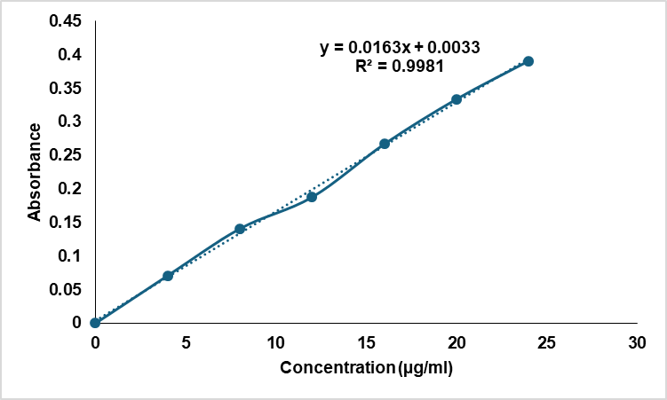 The calibration curve for Ticagrelor in 0.2% w/v Polysorbate 80 showed a clear linear relation between absorbance and concentration from 4–24 µg/ml (fig. 1). Linear regression gave y = 0.0163x+0.0033 with R² = 0.9981, indicating excellent linearity across the range. This near-unity fit supports reliable quantitation for solubility, dissolution, and content uniformity studies. The method meets ICH Q2(R1) and is suitable for further experiments.