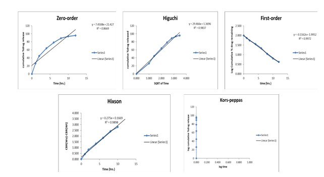 The statistical model validation confirmed excellent agreement between predicted and experimental outcomes for the optimized batch TF5 (table 11). The predicted hardness value of 8.51 kg/cm² closely matched the experimental result of 8.6±0.3 kg/cm², with only a 1.06% error. Similarly, the predicted 12 h drug release of 95.58% was almost identical to the observed value of 95.8±3.7%, showing a minimal error of 0.23%. The desirability function achieved a perfect score of 1.000, confirming the robustness and reliability of the developed model for optimization.