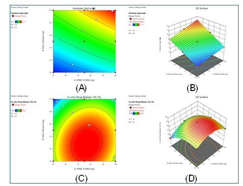 Fig. 8: (A) Contour plot illustrating the effect of HPMC K100M and ethyl cellulose concentrations on tablet hardness, showing a progressive increase in hardness with higher polymer levels. (B) 3D surface plot of hardness confirming the synergistic contribution of both polymers to mechanical strength. (C) Contour plot depicting in vitro drug release at 12 h, where optimal release was observed at intermediate polymer concentrations with clear interaction effects. (D) 3D surface plot of drug release demonstrating the curvature of the response surface, indicating that both HPMC K100M and ethyl cellulose levels significantly influenced sustained release behaviour
