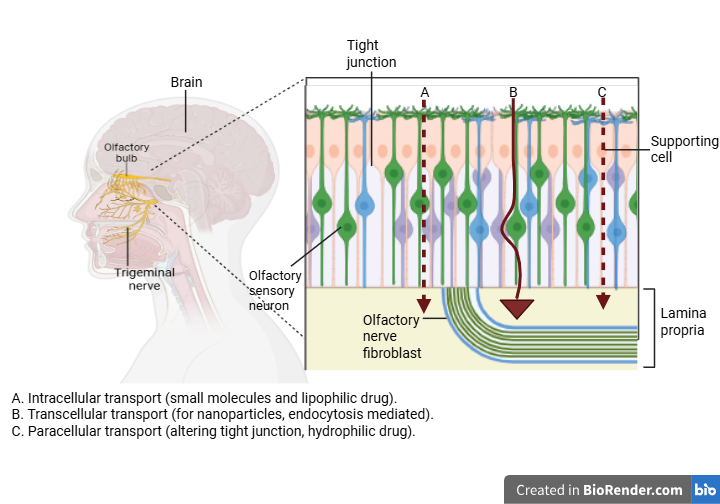 Olfactory region-The olfactory region, positioned at the top of the nostril, is directly connected to the olfactory bulb via sensory neurons that traverse the cribriform plate [75]. This facilitates drug transport through intracellular (neuronal) and paracellular (and perineural) (extracellular) routes, enabling rapid and effective CNS delivery [57].