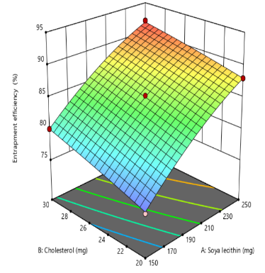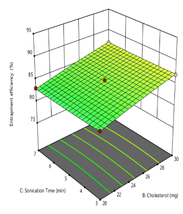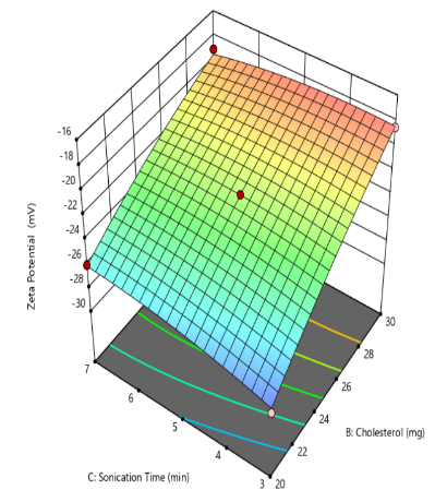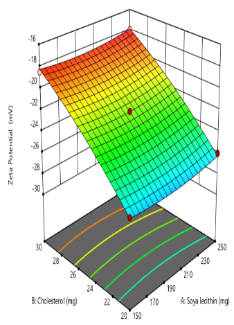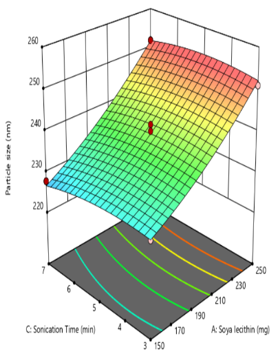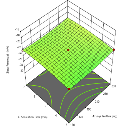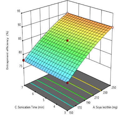 | Formulation | X1:Soyalecithin | X2:Cholesterol | X3:Sonication time (min) | Y1:Particle size (nm) | EE% | Zeta potential(mV) |