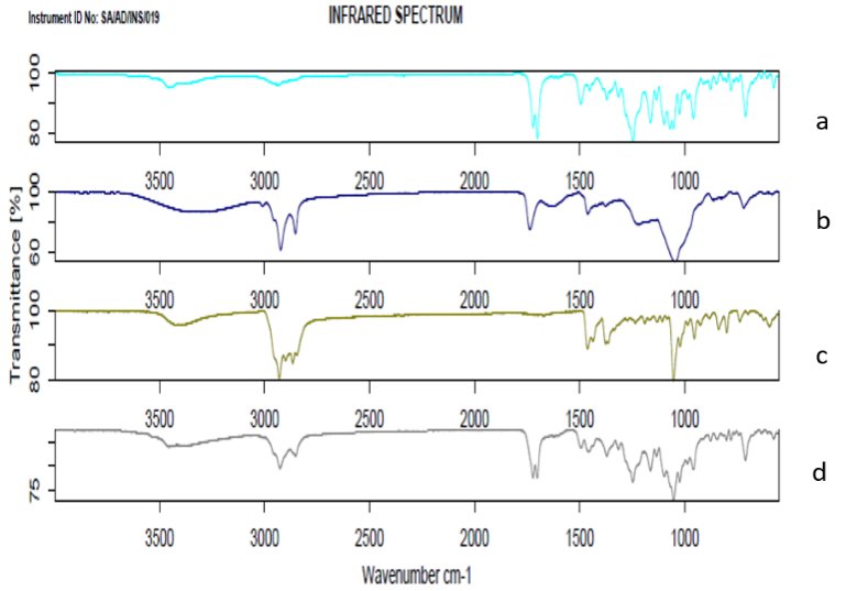 Fig. 5: FTIR study of a: Docetaxel b: Physical mixturec: Opt-DTXL d: FA-Opt-DTXL