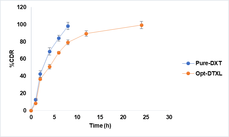 The in vitro release of pure docetaxel (Pure-DXT) and Optimized Docetaxel Liposomes (Opt-DTXL) were evaluated over a 24 h period to assess formulation-dependent modulation of drug release. Pure-DXT exhibited a rapid release profile, with 98.32% of the drug released within 8 h, indicative of an immediate-release behavior typical of unencapsulated drug. In contrast, Opt-DTXL demonstrated a sustained release pattern, reaching 79.32% at 8 h and achieving near-complete release (99.32%) by 24 h. This controlled release is attributed to liposomal encapsulation, which likely imparts membrane stability and diffusion resistance. Overall, both liposomal formulations significantly prolonged the release of docetaxel compared to the free drug, with Opt-DTXL (fig. 6).