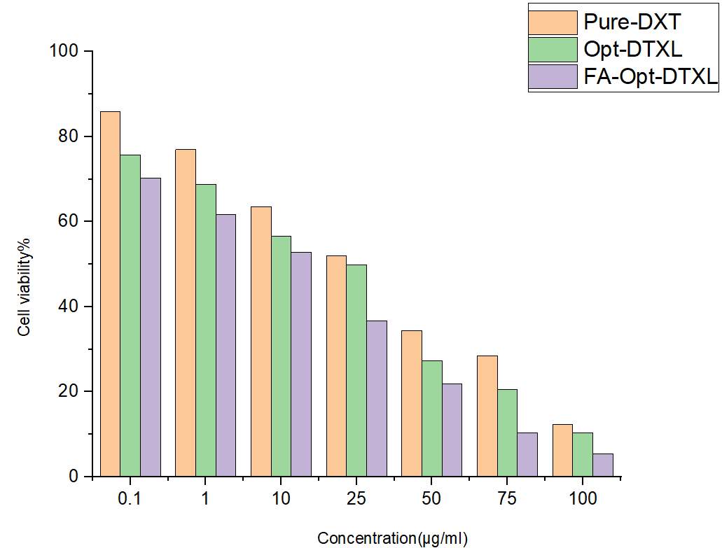 The NCCS in Pune, India, providedA549 lung adenocarcinoma cells. The cells were kept in DMEM media with high glucose supplemented with 10% FBS and 1% antibiotic-antimycotic solution in a CO2 incubator with 5% CO2, 18% O2, and 37 °C. They were subcultured every two days. Cell viability was evaluated using the MTT test, and the cell inhibitory rate was calculated using the formula below [24]. A549 cells were cultured for 24 h after being treated with Pure-Docetaxel, Opt-DTXL and FA-Opt-DTXL at Concentration of 0.1,1,10,25,50,75 and 100 µg/ml. All MTT assays were performed in triplicate (n=3) across three independent experiments to ensure reproducibility and statistical reliability. IC₅₀ values were determined using non-linear regression analysis the sigmoidal dose-response curve produced by GraphPad Prism was used to calculate the IC50. The following formula was used to determine the percentage of cell viability: