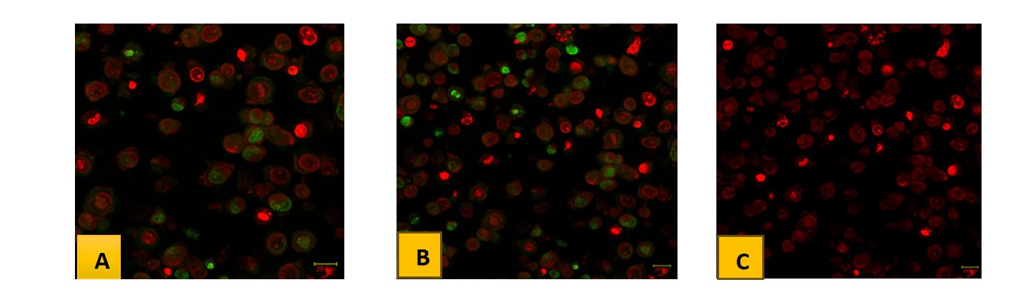 Fig. 8: Acridine orange (AO) and Ethidium bromide (EB) dual staining study of HepG2 cells in Untreated and treated with IC50 concentration of given compounds represented the changes in nuclear morphology of cells. (8A. A549 lung adenocarcinoma cells with pure docetaxel, 8B. A549 lung adenocarcinoma with Opt-DTXLand 8C. A549 lung adenocarcinoma with FA-Opt-DTXL) AO represents viable cells (green) and EtBr represents dead cells (red color). All the images were captured at 25x magnification. Scale bar-20um
