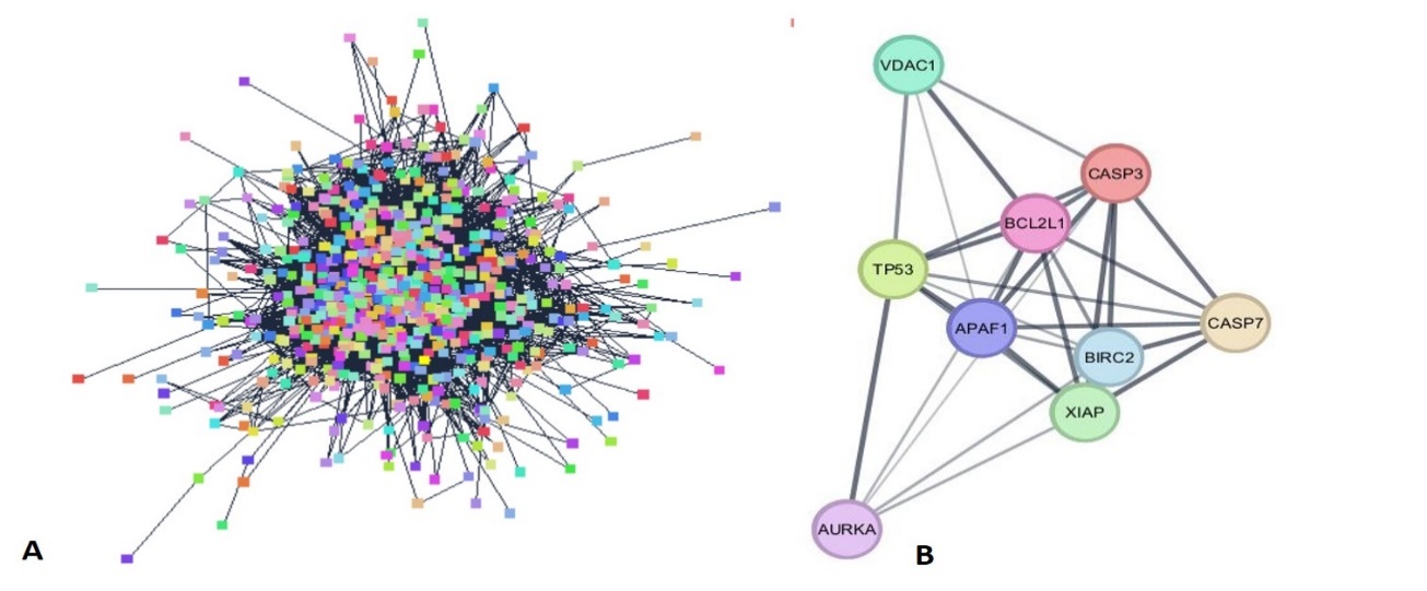 Fig. 9: PPI Network of: A-All 1118 common targets, B-9 best targets as per the closeness in the string network
