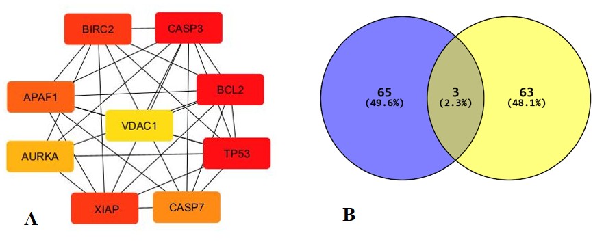 Fig. 10: Top shortest targets (compound network as per degree of closeness) estimated by cytohubba: BCL2L1, BIRC2, CASP3, APAF1, XIAP, CASP7, VDAC1, TP53 and BCL2L1