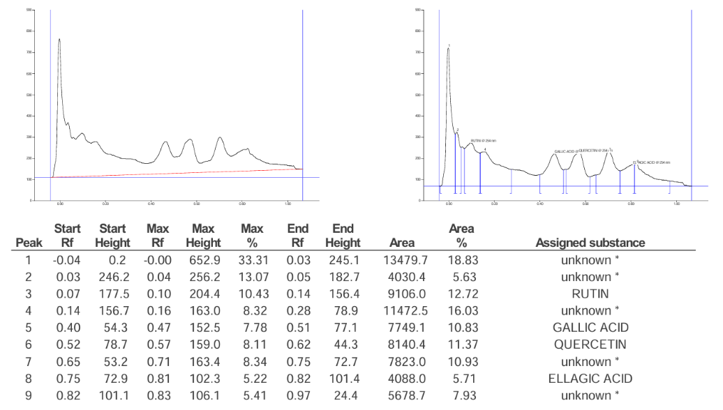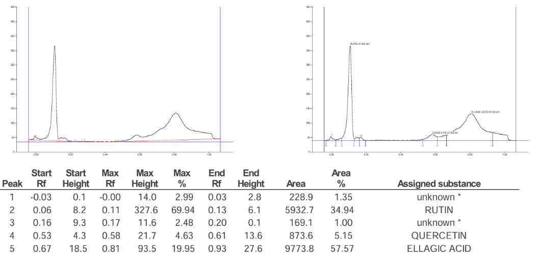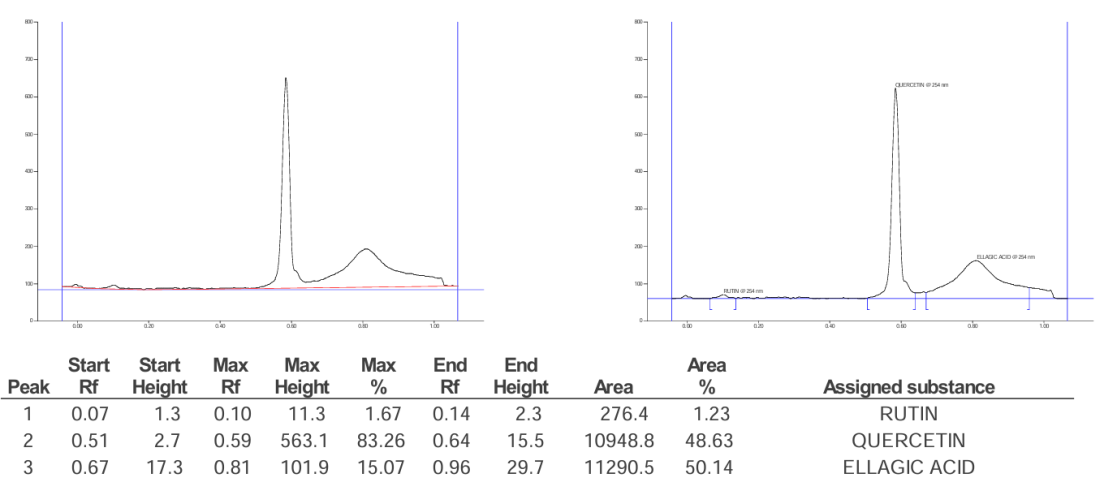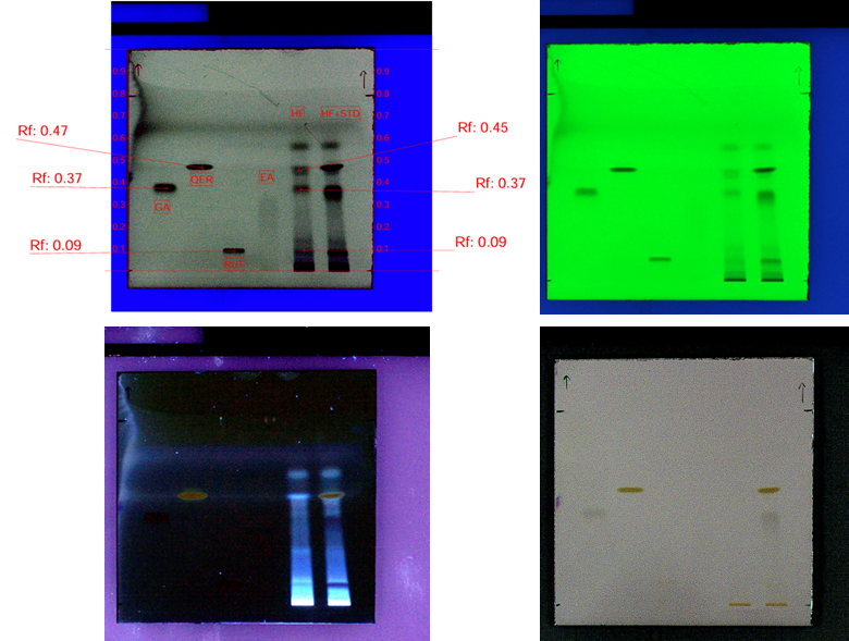 The study uses the following instrument CAMAG visualizer: 201398 (Visualizer_201398), winCATSplanar chromatography manager, CAMAG TLC scanner "scanner_201368" S/N 201368 (2.01.02), twin trough chamber 10x10 cm glass tank, CAMAG automatic TLC sampler 4 (ATS4) "ATS4_201152" S/N 201152 (1.02.18), UV-visible double beam spectrophotometer (LabtronicsLT-2700).