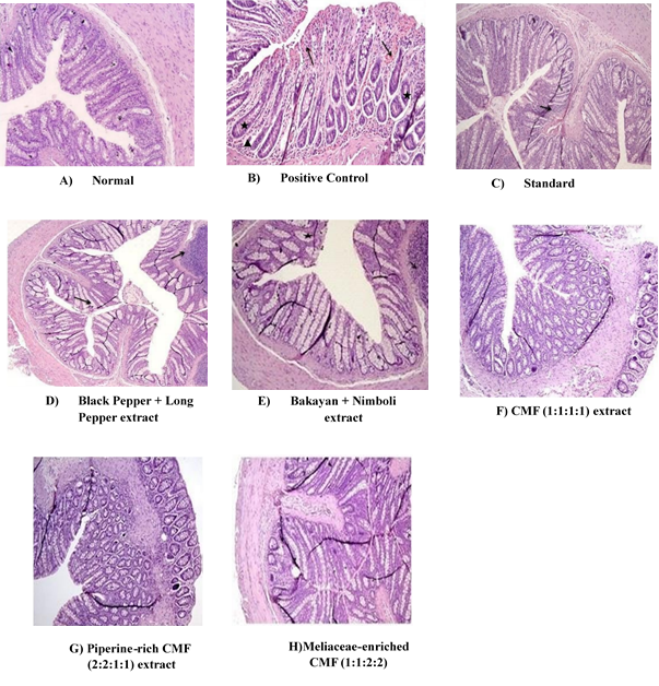 Where, T. S. = Transverse section, A)-Group-I: represents normal cell arrangement, architecture, and intact mucosal lining; B) Disease control Group II: ◊Tissue hemorrhage, Δ with elongation of rectal blood vessel necrosis, ☆degenerative changes were identified in disease control animals; C) Group III-Nonsignificant inflammatory changes with minimal structural alterations in standard drug treated animals; D) Group IV: Mild pathological changes like inflammation and hemorrhage in rats treated with black pepper+long pepper extract; E) Group V-Mild to moderate inflammation, hemorrhage, necrosis appeared in rats treated with bakayan+nimboli extract; F) Group VI-Minimal inflammatory phase, blood marks, necrosis, blood vessel damage in rats applied with CMF (1:1:1:1) extract; G) Group-VI: Inflammation, hemorrhage, blood vessel dilation is minimal in rats rectal tissue treated with Piperine-rich CMF (2:2:1:1); H) Last Group VII: inflammation and non-significant changes noticed in cellular architecture of rectal tissue of rats treated with meliaceae-enriched CMF 400 mg/kg/Ir.