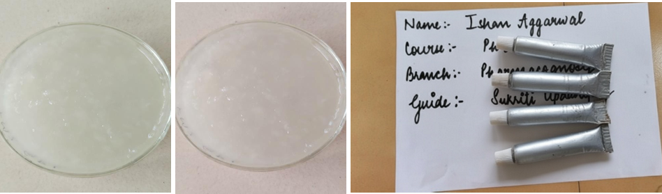 To obtain the best gels possible, variable concentration of different gelling agents was optimized to achieve best viscosity, spreadability and homogeneity. Carbopol 934, HPMC, and Na-CMC at a concentration range of (1.0–2.5) % were separately taken for evaluation. On behalf of anti-hemodialysis activity CMF (1:1:1:1) and CMF (1:1:2:2) is selected for formulation of gel. The pH, viscosity, spreadability, extrudability, and homogeneity of all prepared gel formulations were assessed. The six gel formulations made from carbopol with different concentration which are CMF-1111 – G1, G2, G3 and CMF-1122 – G1, G2, G3 were selected as optimal ones. Each polymer were dispersed singly in distilled water and stirred. After that methyl paraben (0.5 g) was added as the preservative and propylene glycol 400 (5 g) used as the cosolvent and the humectant. The polymer base was hydrated and then a CMF-1111 or CMF-1122 extract of 2 gs was added. Triethanolamine was added to the mixture so that the pH was adjusted towards the gel formation range of 6.8-7.0. The control gels were made the same way as other gels, except that no extract was added.