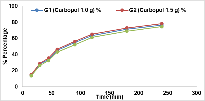 | Time (min) | G1 (Carbopol 1.0 g) % | G2 (Carbopol 1.5 g) % | G3 (Carbopol 2.5 g) % |