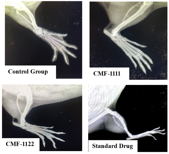 The anti-inflammatory property of the polyherbal gel formulations were studied using the carrageenan-induced paw edema method in Wistar rats. The right back paw of the mouse was injected subcutaneously with 0.1 ml of freshly prepared 1% carrageenan suspension to induce edema. This model can be used to test the application of anti-inflammatory agents and shows a 2-phase response. The first phase, which is 0–2-hour duration, protects from or limits an injury. This phase gets positively influenced as formation of serotonin and histamine occurs directly. The next phase is 2–4-hour duration, which brings about injury. In this phase, bradykinin and prostaglandin form an influence. Maximum edema is seen 4 h post the injection. Rats were randomly divided the rats into groups of 6, creating a total of 4 groups, as shown in table 2 [30-32].
