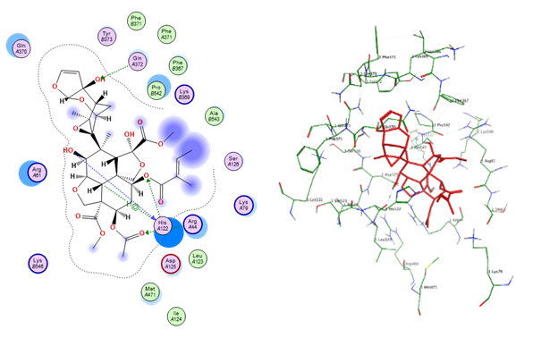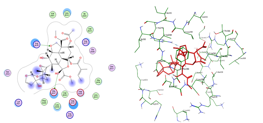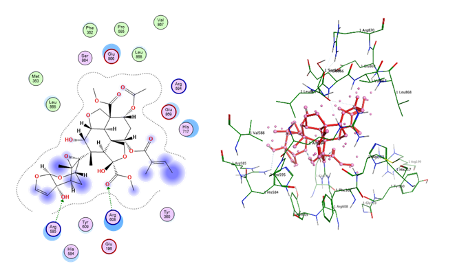 | 4 | Nimbolide | 5-ring | N–Val867 (A) | π–H | 3.91 | −2.6 | −6.7458315 | 1.4956416 |