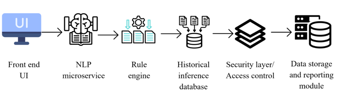 Fig. 1: WinAI platform architecture showing secure user interface (UI), natural language processing (NLP) microservice, deterministic rule engine, and historical inference database supporting recurrence-based risk escalation