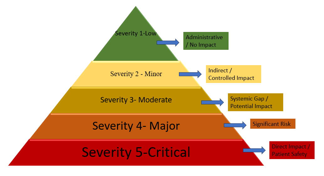 | 5 – Critical | Confirmed deviation compromising patient safety | Imminent regulatory action/recall | Cross-contamination, data falsification |
