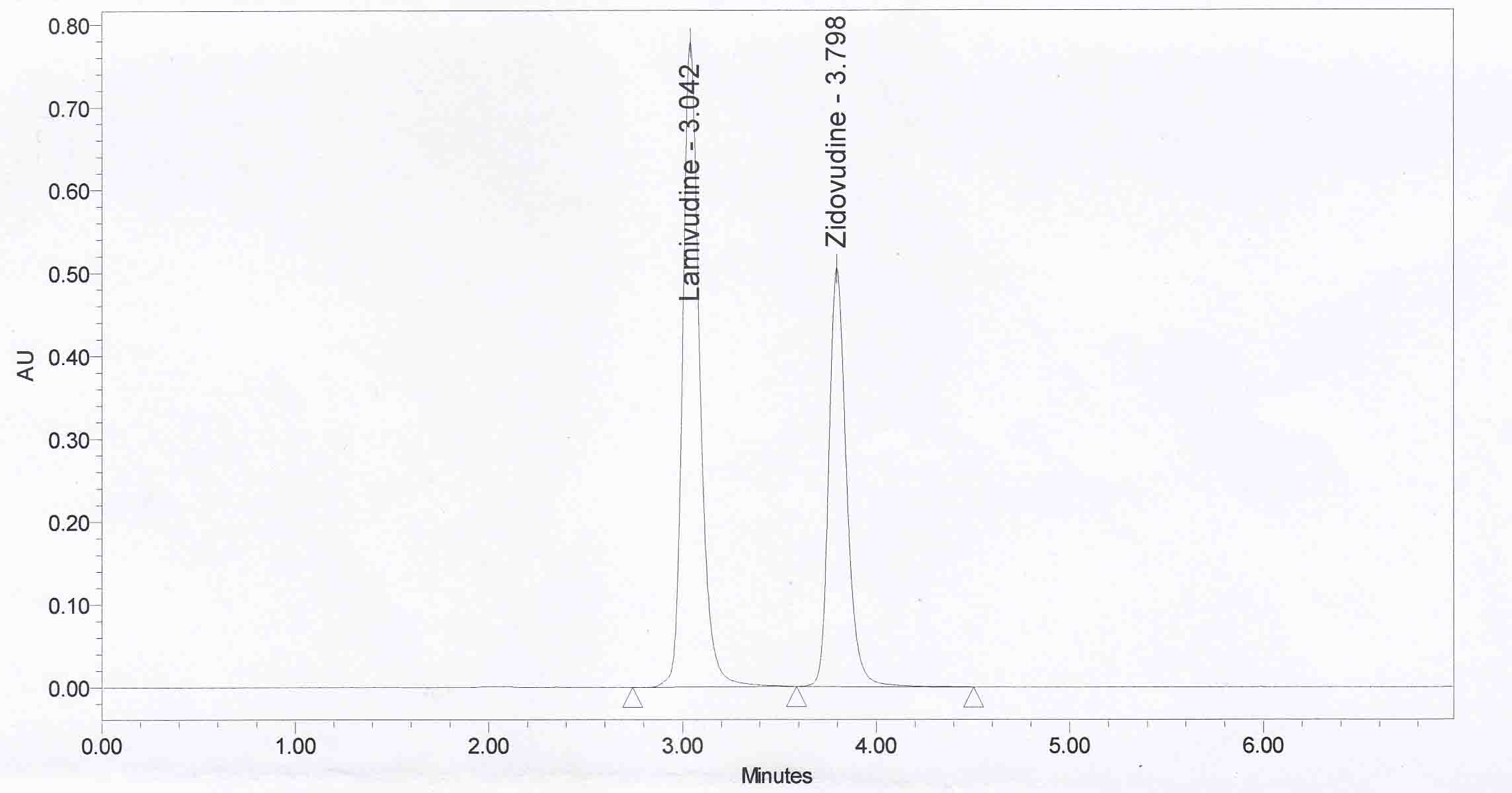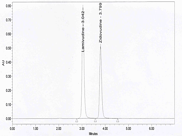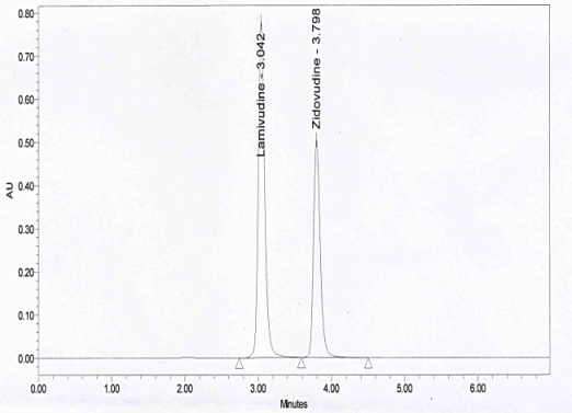 Conclusion: Hence, the chromatographic method developed for Lamivudine and Zidovudine is said to be rapid, simple, specific, sensitive, precise, accurate and reliable that can be effectively applied for routine analysis in research institutions, quality control department in industries, approved testing laboratories, bio-pharmaceutics and bio-equivalence studies and in clinical pharmacokinetic studies.